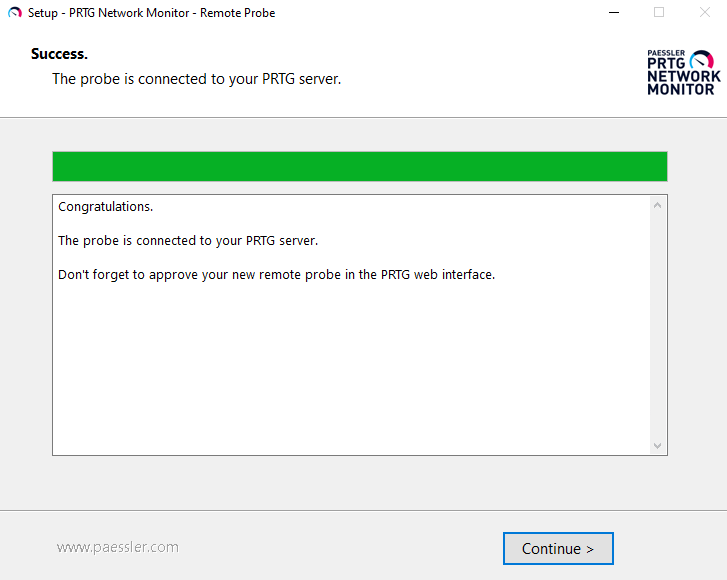 4. Wait until the installation is completed. The classic remote probe then automatically connects to your PRTG core server.