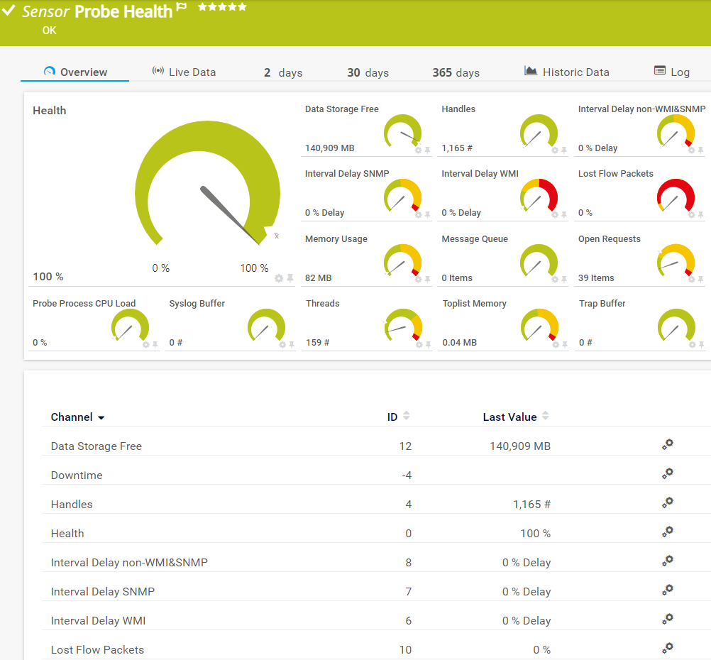The Probe Health sensor monitors internal PRTG parameters. It shows the status of the probe system and checks various parameters of the probe system that can affect the quality of the monitoring results.